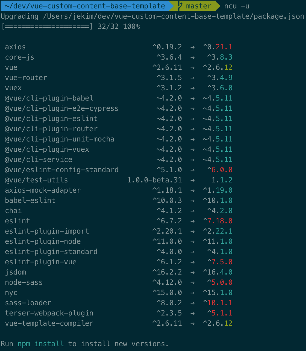 다만 마지막 줄에 Run npm install to install new versions. 라는 안내 문구가 붙었다.